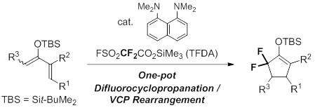 7. Metal-free synthesis of α,α-difluorocyclopentanone derivatives via regioselective difluorocyclopropanation/VCP rearrangement of silyl dienol ethers (KL-10290OP)
